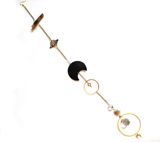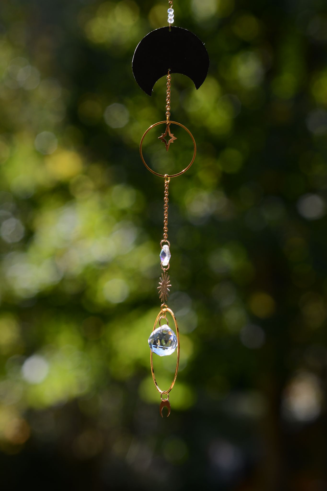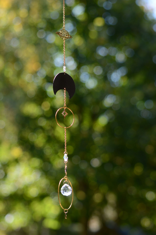 🌙Prisme: boulle à facettes en cristal (verre pur) de 20 mm de diamètre. Croissant de Lune noir en chambre à air de tracteur♻️. Petites perles en verre facetté d'un collier♻️. Soleil, petit croissant de lune, saturne, étoile et anneaux en laiton brut. Morceau de hêtre ramassé dans le Massif du Sancy (Auvergne)