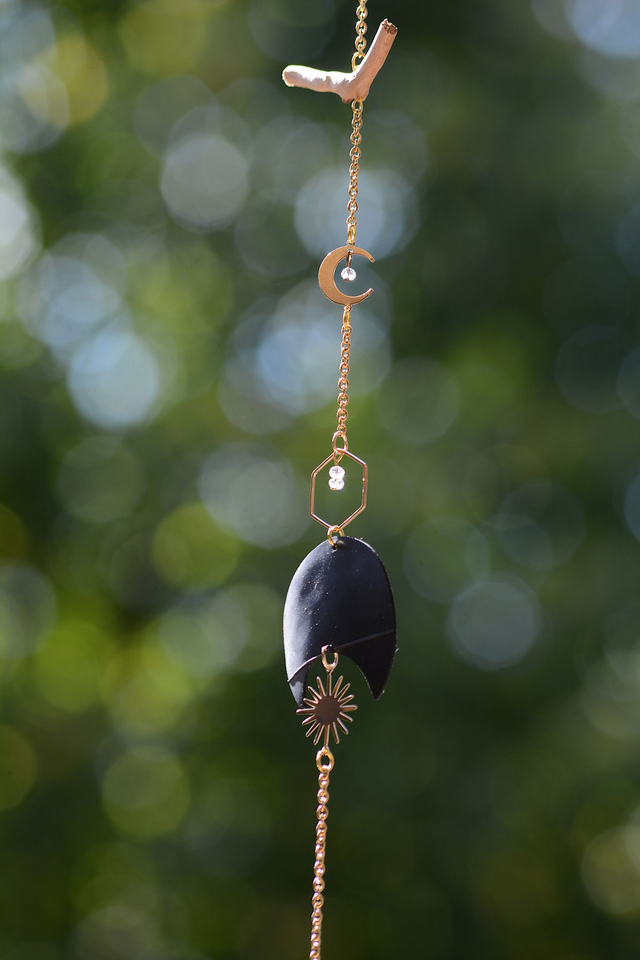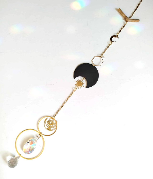 🌙Prismes: boulle à facettes en cristal (verre pur) de 20 mm de diamètre & goutte (3.5 cm x 2.5 cm). Croissant de Lune noir en chambre à air de tracteur♻️. Petites perles en verre facetté d'un collier♻️. Fleur de lotus, soleil, petite lune et anneaux en laiton brut. Morceau de hêtre ramassé dans le Massif du Sancy (Auvergne)