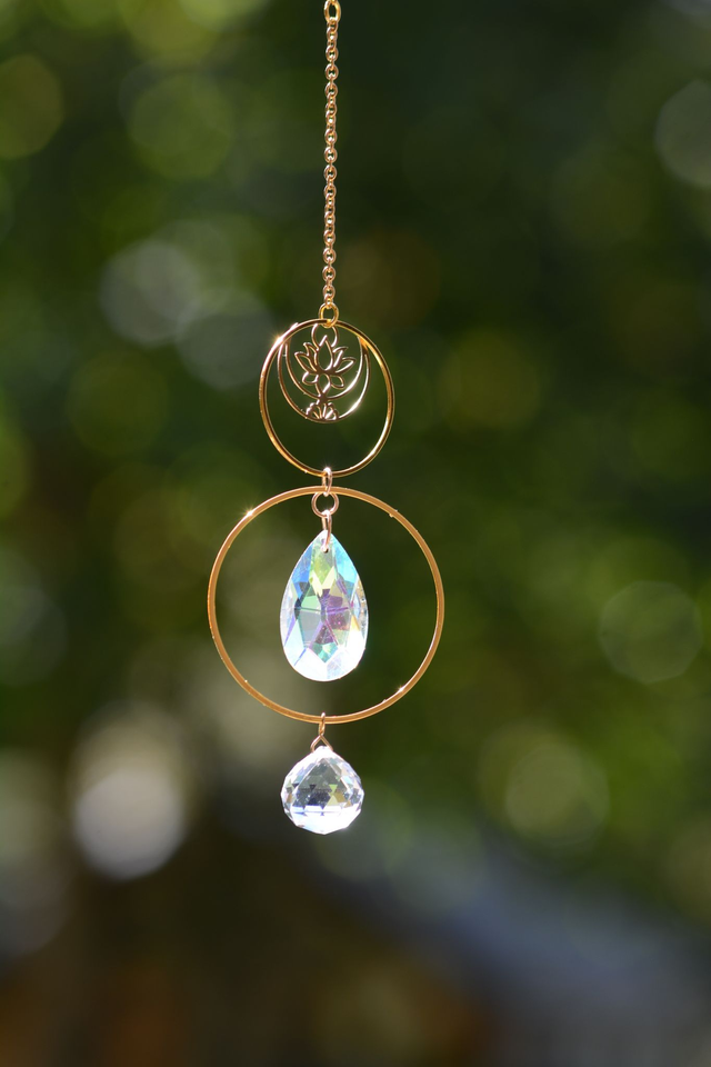 Attrape soleil = objet décoratif spirituel Feng-Shui aux pouvoirs puissants. Réfléchi la lumière et disperse les rayons du soleil afin d'inonder la pièce de points lumineux apaisant aux teintes arc-en-ciel. Outil puissant en chromothérapie: la lumière colorée (spectre) qui est projetée dans votre intérieur vous apportera joie et optimisme.
