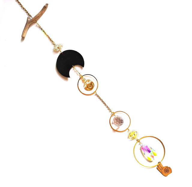 🌙Prismes: boulle à facettes en cristal (verre pur) de 20 mm de diamètre & goutte (3.5 cm x 2.5 cm). Croissant de Lune noir en chambre à air de tracteur♻️. Petites perles en verre facetté d'un collier♻️. Œil protecteur, Fiole magique,Main Protectrice et anneaux en laiton brut. Morceau de hêtre ramassé dans le Massif du Sancy (Auvergne)