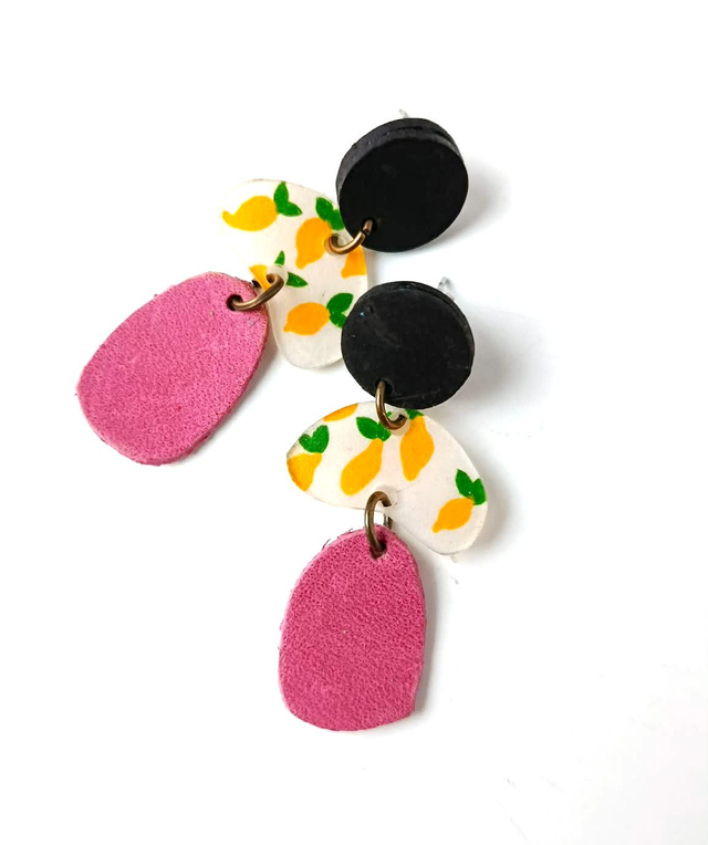 Boucles d'Oreilles Inspiration Années 70 - Chutes de CUIRS, Chambre à Air et PLASTIQUE FOU - Citrons - Pièces Artisanales et Uniques