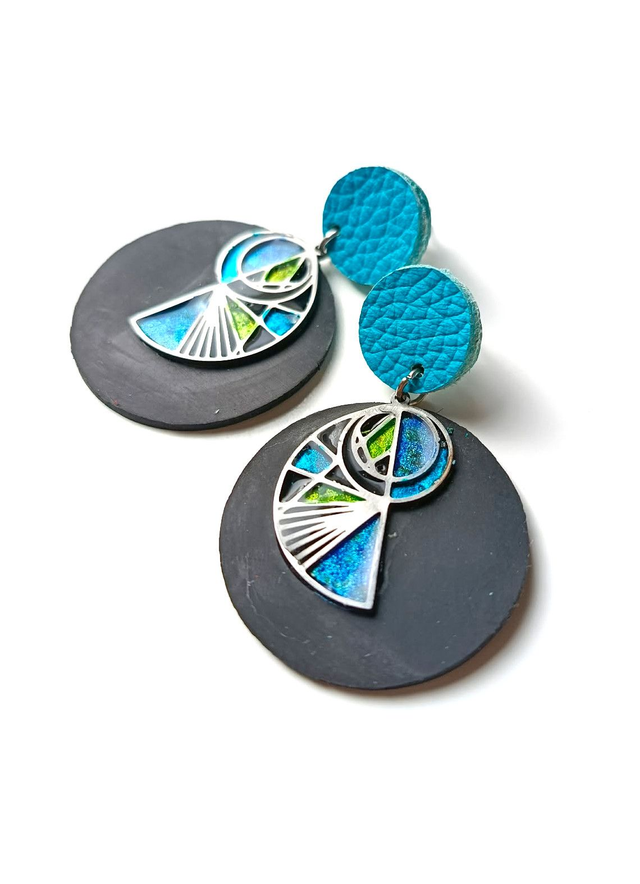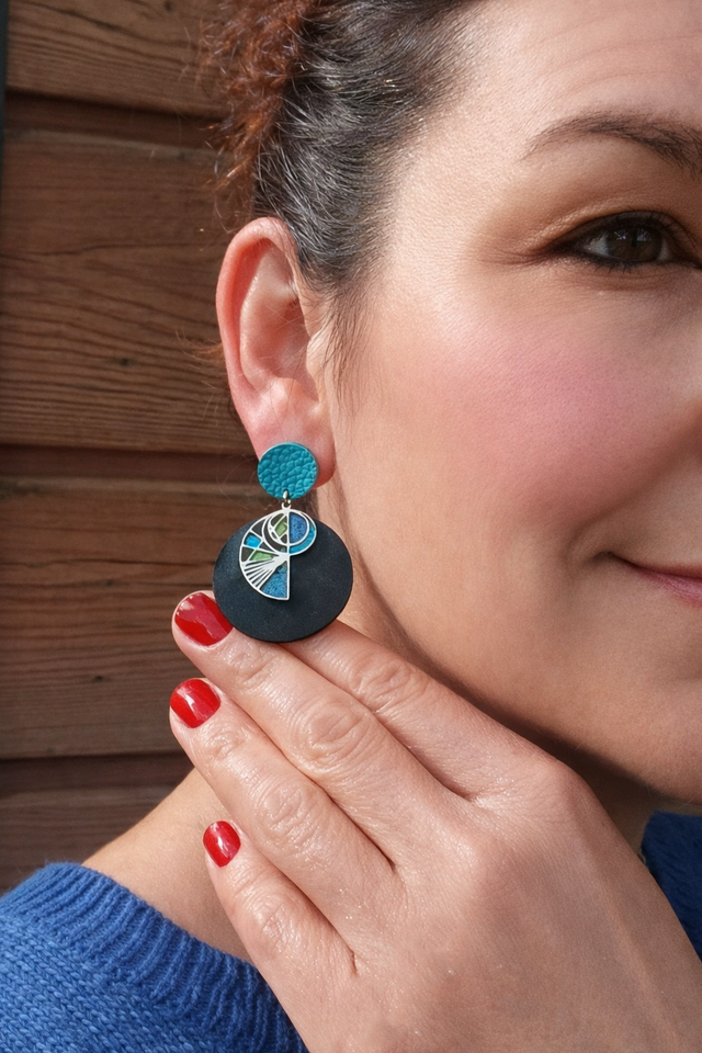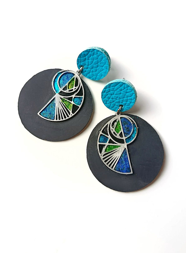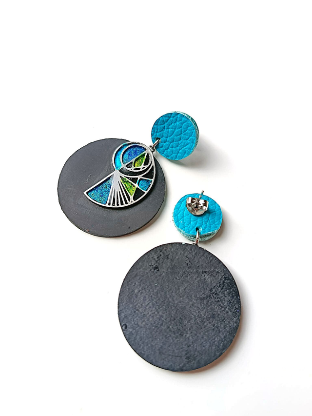 Chaque Prêtresse est façonnée à partir d’une chambre à air agricole♻️ transformée à la main. J’y associe des éléments en acier sélectionnés avec soin, pour créer un dialogue entre matière brute et lignes contemporaines. Chaque pièce est unique, peinte et résinée goutte à goutte au cure-dent et assemblée dans mon atelier. Puce d'oreille turquoise découpée à la main dans une chute de cuir ♻️.