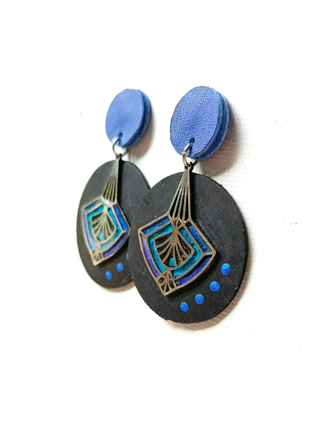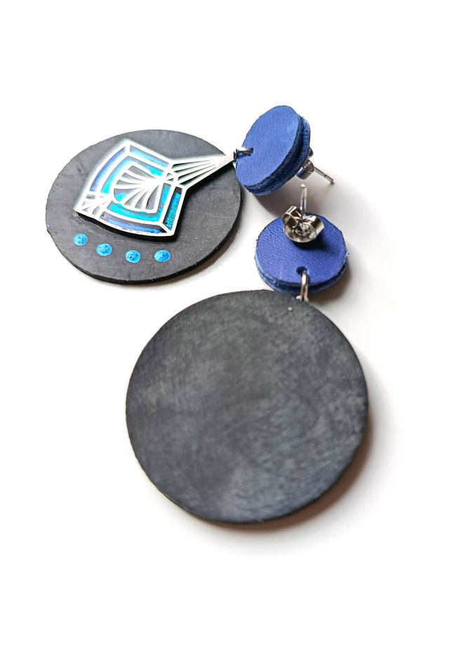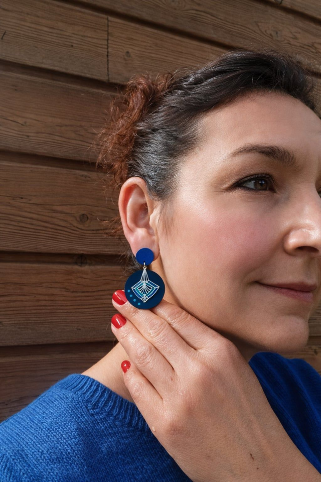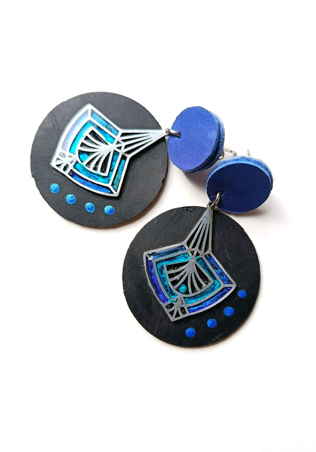 Chaque Prêtresse est façonnée à partir d’une chambre à air agricole♻️ transformée à la main. J’y associe des éléments en acier sélectionnés avec soin, pour créer un dialogue entre matière brute et lignes contemporaines. Chaque pièce est unique, peinte et résinée goutte à goutte au cure-dent et assemblée dans mon atelier. Puce d'oreille bleu découpée à la main dans une chute de cuir ♻️.