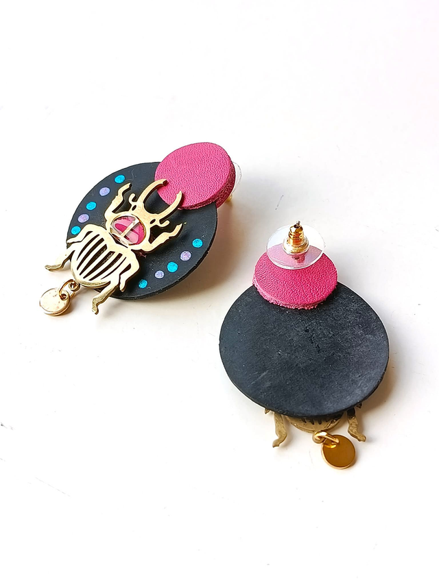 Chaque Prêtresse est façonnée à partir d’une chambre à air agricole♻️ transformée à la main. J’y associe des éléments en acier sélectionnés avec soin, pour créer un dialogue entre matière brute et lignes contemporaines. Chaque pièce est unique, peinte et résinée goutte à goutte au cure-dent et assemblée dans mon atelier. Puce d'oreille rose découpée à la main dans une chute de cuir ♻️.