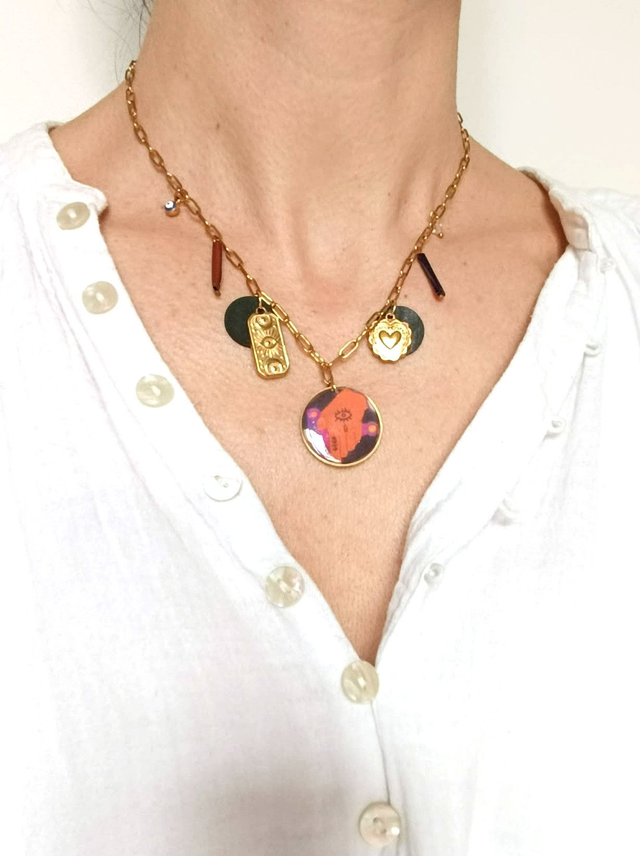 Pendentif réalisé à partir d'une carte de Tarot recyclée♻️️ (découpé à la main, puis insérée dans un anneau doré avec de la résine) - Main protectrice . Breloque acier (carte tarot et coeur) sur disque noir en chambre à air de tracteur ♻️. Deux perles tubulaires en aluminium de capsule de café ♻️. Oeil Nazar Boncuk en acier (chasse le mauvais œil) et petite perle en cristal de verre♻️.